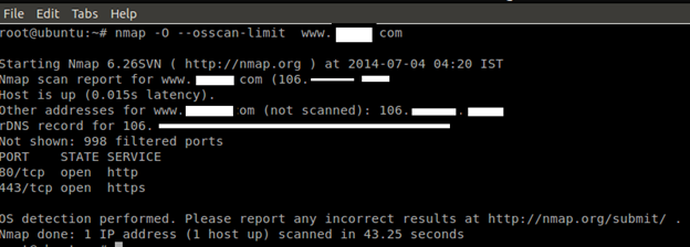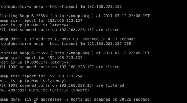 A host may take a long time to scan if it is located on a slow or unreliable network. Systems that are protected by rate limiting firewalls may also take a considerable amount of time to scan. The --host-timeout option instructs Nmap to give up on the target system if it fails to complete after the specified time interval. In the above example, the scan takes longer than one minute to complete (as specified by the 1m parameter), which causes Nmap to terminate the scan. This option is particularly useful when scanning multiple systems across a WAN or Internet connection.