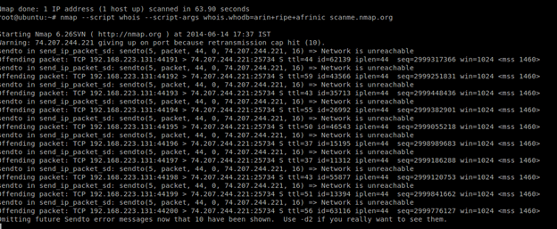 The argument --script whois tells Nmap to query a Regional Internet Registries WHOIS database in order to obtain the records of a given target. This script uses the IANA's Assignments Data to select the RIR and it caches the results locally. Alternatively, we could override this behavior and select the order of the service providers to use in the argument whodb: