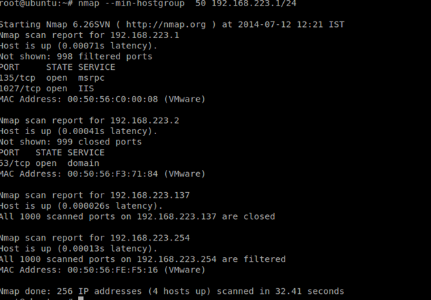 As a pentester we should not waste our time by scanning one by one. Instead we can do optimization by scanning many at a time. Nmap does this by dividing the target IP space into groups and then scanning one group at a time. In general, larger groups are more efficient. The downside is that host results can't be provided until the whole group is finished.