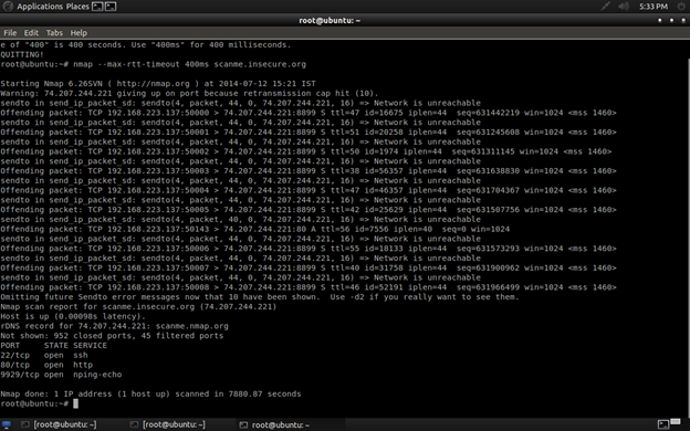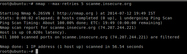 By default, Nmap will automatically adjust the number of probe retransmissions based on network conditions. The --max-retries option can be used if we want to override the default settings or troubleshoot a connectivity problem. Specifying a high number can increase the time it takes for a scan to complete, but will produce more accurate results. By lowering the --max-retries we can speed up a scan, although we may not get accurate results if Nmap gives up too quickly.