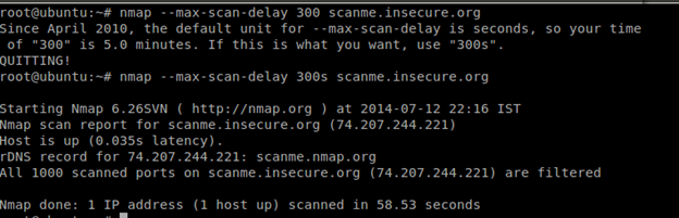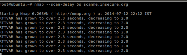 syntax: nmap --max-scan-delay [time] [target]