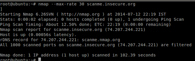 In the example above, specifying --max-rate 30 instructs Nmap to send no more than 30 packets per second. This can dramatically slow down a scan but can be helpful when attempting to avoid intrusion detection systems or a target that uses rate limiting.