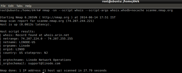 WHOIS records often contain important data such as the registrar name and contact information. System administrators have been using WHOIS for years now, and although here are many tools available to query this protocol, Nmap proves itself invaluable because of its ability to deal with IP ranges and hostname lists. Open up the command line and write the commands like:
