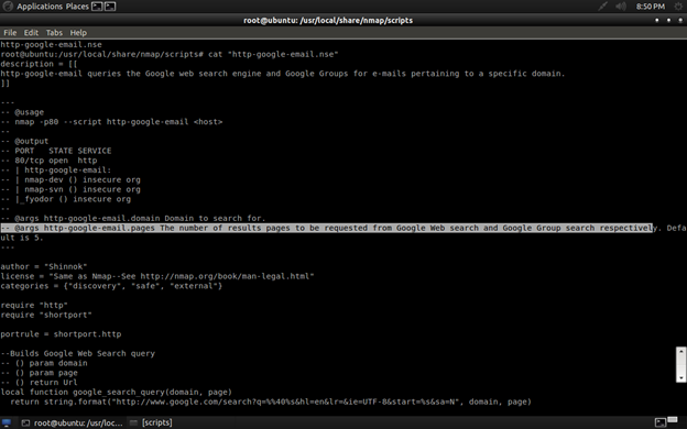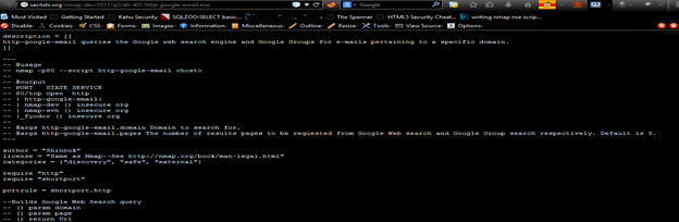 To run these methods we have to run the NMAP script. The script http-google-email is not included in Nmap's official repository. So we need to download it from http://seclists.org/nmap-dev/2011/q3/att-401/http-google-email.nse and copy it to our local scripts directory. As you can see, the following screenshot has details for the email collector script: