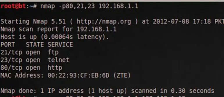 If you want to scan a specific port on the target machines (for example, if you want to scan the HTTP, FTP and Telnet ports only on the target computer), then you can use the Nmap command with the relevant parameter: