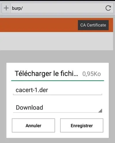 - Navigate to http://burp suite to download burp suite certificate to be able to intercept SSL traffic.