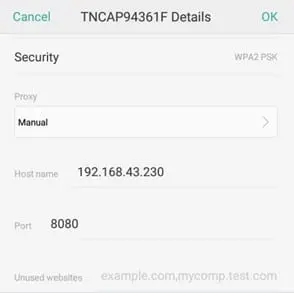 Once the above step has been accomplished, enter the IP Address of your machine and the listening port of Burp Suite (by default this is 8080). This is illustrated in the screen below: