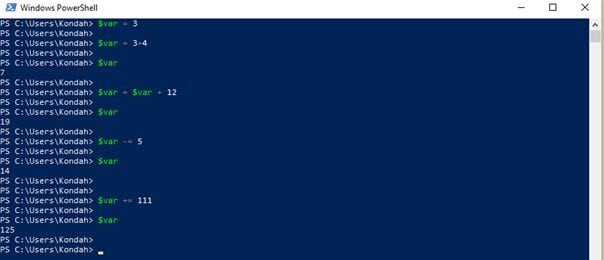 Figure 4: Creating and manipulating a variable with PowerShell using assignment operators