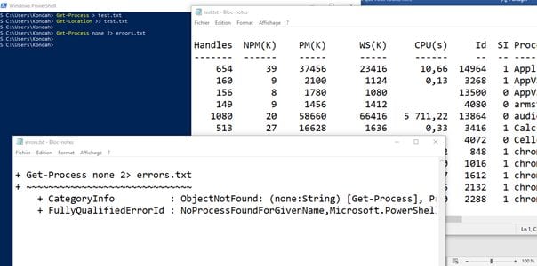 - 2>: Sends errors to a specific file (Get-Process none 2> Errors.txt)