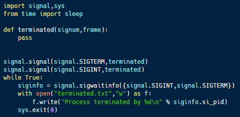 By using the signal library, the program can catch certain exceptions, allowing it to control how they are handled. In this case, the Python script catches SIGTERM and SIGINT, two signals designed to terminate a process. When a SIGTERM or SIGINT signal is caught, the program collects and writes information about the process that sent the signal to a file and then terminates (to make the signal seem successful).