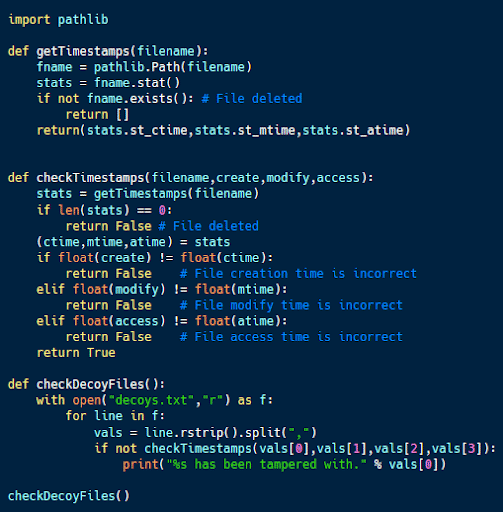 The code sample above (from here) is designed to detect if someone accesses or modifies certain files on the system. These files are listed in decoys.txt alongside their official creation, modification and access dates.