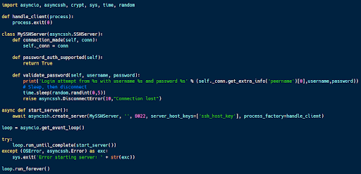The code sample above (available here) implements an SSH server that is designed to accept connection attempts. After accepting the connection, it sleeps for a random amount of time, then throws an error, emulating a lost connection.