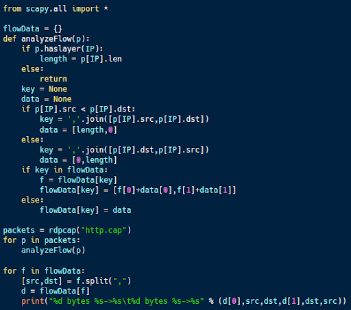 The code sample above (available on Github) uses scapy and Python to perform high-level statistical collection for network traffic. For each pair of communicating computers, it determines the number of bytes flowing from one to the other and vice versa.