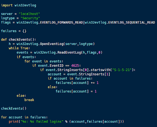 The code sample above (available here) is designed to monitor for failed login attempts on a Windows system. These failed logins can be indicative of a credential stuffing or other password guessing attack.