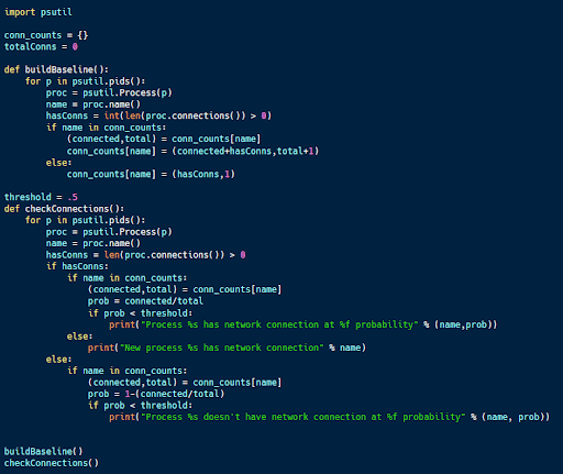 The code sample above (available here) looks at the network connections of various processes running on a computer. It’s designed to build a baseline profile of how processes connect to the network, then later run the same analysis and compare the results to identify any anomalies.