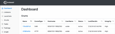The Covenant agent known as “Grunt” is developed in C#, and it can be customized directly on the C2 web portal. Many features are provided, such as lateral movement techniques, mimikatz, exfiltration scripts and so on. More details about this open-source project can be found on the GitHub page.