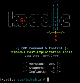 Koadic is an open-source tool and is available on Github. This framework is written in Python, and its payloads are JavaScript-based with XOR encryption. The agents are installed on the target machines using the default mshta or using the default mshta or Microsoft HTML Application stagers.