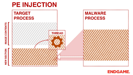 This technique is similar to the reflective DLL injection as it doesn’t drop the PE file on the disk. PE injection is the most widely used technique in the wild by malicious authors and malware. In short, the code is injected into a target process and executed. The following steps below describe how this approach works: