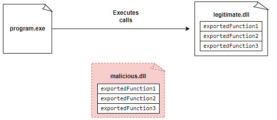 Before the DLL proxy technique: program.exe calls the functions from the legitimate.dll.