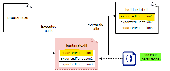 After the DLL proxy technique: program.exe calls the "exportedFunction1" from the original DLL (legitimate.dll - the hooked DLL), the persistent code is loaded into the memory, for instance, a code capable of running a bind shell, and the execution is forwarded to the original DLL renamed to "legitimate1.dll".