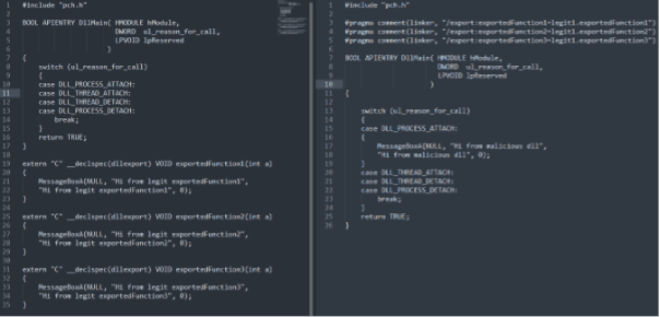 A potential code to perform this task is presented below. On the left side, we can see all the legitimate exported calls. The proxy is achieved on the right side using a linker to the right DLL (the original one), and the malicious or persistence is executed when the DLL process is attached.
