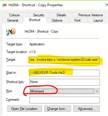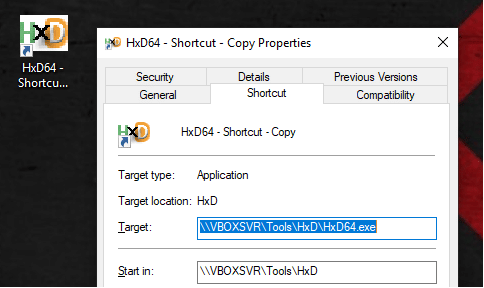 A common way of creating persistence on a target machine is poisoning a simple shortcut. By changing the "Target" field, we can tell the shortcut what it should execute. The next image shows that the HxD64.exe program is opened after executing the shortcut file.