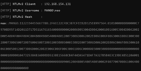 As you were auditing an active directory network and got a valid NTLMv2 hash from a domain user with Responder, the best thing to do is crack it with hashcat. Imagine you have the following NTLMv2 from the Mango domain captured with Responder:
