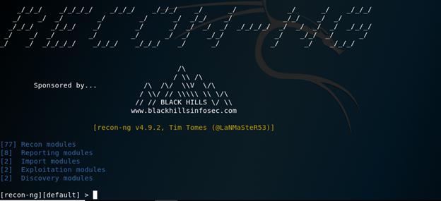 Recon-ng is another useful tool to perform reconnaissance on the target. It is also built into Kali Linux. Recon-ng has various modules built in, and its usage somewhat resembles that of Metasploit. Below is the welcome screen of Recon-ng on Kali Linux.