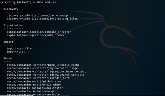 As mentioned above, Recon-ng has various inbuilt modules. A snippet of that is shown below.