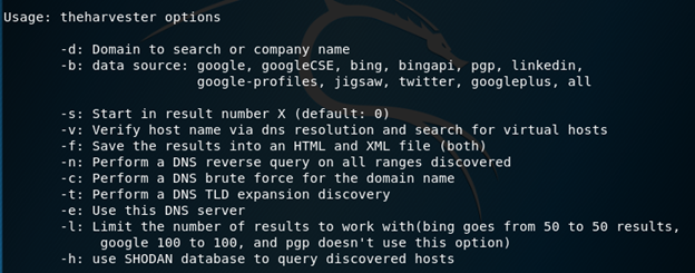 theHarvester is an excellent tool for collecting info from the specified target. theHarvester is inbuilt into Kali, is very fast and is much simpler to use than Recon-ng to collect basic information. Below is the welcome screen of theHarvester in Kali Linux.