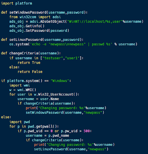 Python, with the help of a few packages, can access and modify details of user accounts on both Windows and Linux systems. This makes it possible to deny access to these accounts by changing the associated passwords.