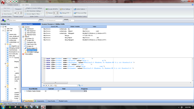 Once done, start the session and start the scan. The scanner will crawl the whole website and will show the scripts, broken pages, hidden fields, information leakage, web forms related information which helps to analyze further.