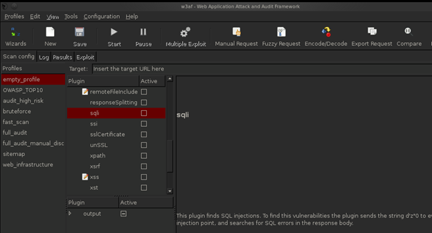W3af is another famous open source web application auditing and attack tool. It's basically divided into various modules like attack, audit, exploit, discovery, evasion, brute force, and mangle which can be used accordingly. These modules in w3af comes with various sub modules like for example, we can select sqli option in Audit module if we need to perform a particular type of auditing.
