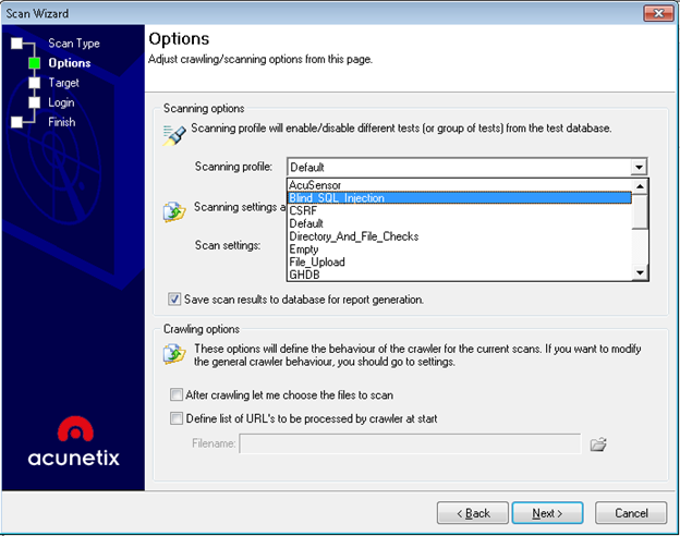 Once the target site is selected, the next step is where you can select the scan profile. This option really saves the time while performing a vulnerability scan. If you want to perform a specific scan like for example Blind sql injection, the scanner would test only for Bsqli rather than performing other scan tests.