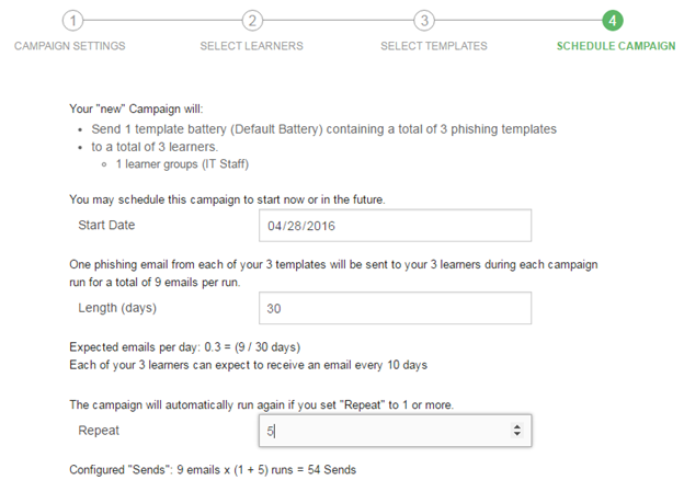 Helpfulness is one of the human traits often abused in social-engineering attacks (phishing included). It can also hurt the effectiveness of your simulated phishing campaigns if you have employees who are so "helpful" that would do a disservice to their colleagues by notifying them about an ongoing phishing campaign. "Oh, watch out guys, just got another Low Balance Alert! Security is out to get ya!" If you think that this is something that may likely happen in your organization, try introducing a bit of organized chaos to your campaign. Segmentation helps here as well. You can split your groups into even smaller groups, then select different batteries of templates for each group, and start your campaigns a day or two apart. Timing options can be easily customized in Phishsim (see the image below).