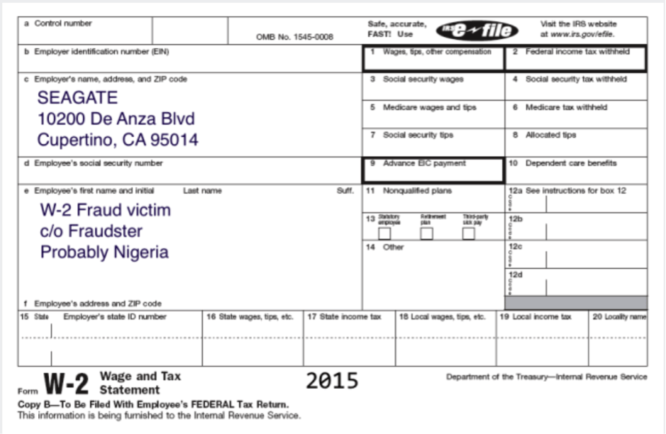 Figure 1. W-2 tax form illustrated by the lure used by the cybercriminals