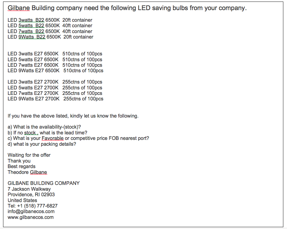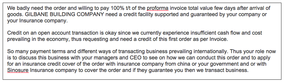 In this case, the cybercriminal took the identity of Gilbane Building Company and made a reproduction of its website to lure a company that manufactured LED bulbs. The goal of the hacker was to get products delivered to his address without paying for them. He simulated a momentary lack of cash flow in Gilbane Building Company, making the company resort to an open account credit to supposedly pay its order. To be credible as much as possible, he sent the manufacturer the actual information about the company registration number, the data universal number (DUN), the taxpayer identification number (TIN), and other authentic buyer information and asked to apply for the credit from Sinosure Insurance Company. In the end, the trick did not work, as the company’s management discovered from the beginning the fake email address and domain which was www.gilbanecos.com instead of www.gilbaneco.com and the lack of credibility to the manufacturer’s top management (Figures 2 and 3).