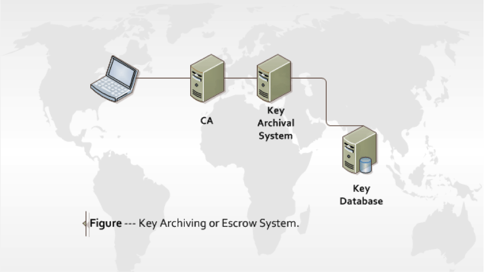Key Escrow: Key Escrow is a storage process whereby the secure copies of private keys are held in an Escrow, a centralized management system as shown in the Figure below. A secure copy of a user’s private key can be restored from the Escrow when the key is lost or in the event of a disaster. Deployment of Key Escrow in PKI is inevitable if data loss is unacceptable or data has high sensitivity level such as state’s internal or external security information. When a key is lost, the Key-escrow agent retrieves a secure copy of that key held in an Escrow to recover data encrypted with the lost or damaged key.
