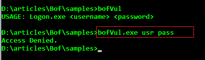 Sometimes hackers find other ways to exploit the overflow besides getting their code to run. Certain overflows do not actually allow hackers to take control, but might instead allow them to manipulate extra data. Let's examine the following bofVul.exe login console based program which accepts user name and password at the command line to validate users. If they enter the correct username and password, it allows access; otherwise, access is denied as follows: