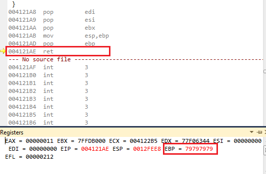 Thereafter, the ret opcode is executed, which points out the end of program instructions. If a parameter is entered in the correct form or lesser than the fixed length, the program doesn't show any abnormal behavior. But as we are passing the argument beyond the limit, here we examine the register EBP value as 79797979 which becomes the ESP now as follows: