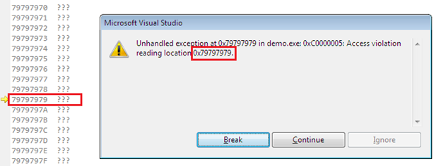 As we move ahead, the execution should jump to 00412209 instead of 0079797979. Hence, Visual Studio throws a run time exception at 79797979 offset where the program denies reading the address space at 79797979 locations. So, the program crashes because execution is halted due to access violation, and buffer overflow attacks occur as follows: