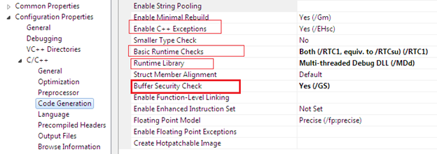 - Basic Runtime checks (Enable VC++ Run time Library)