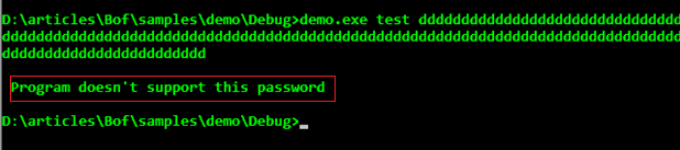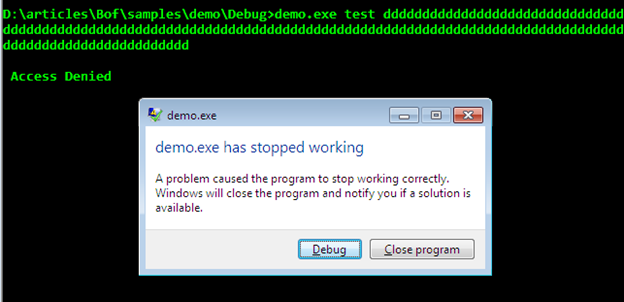 Now a buffer overflow attack can be thwarted even if other protections such GS and DEP are not applied at solution configuration. Here, the program alters and exits if data is entered beyond the buffer limit as follows: