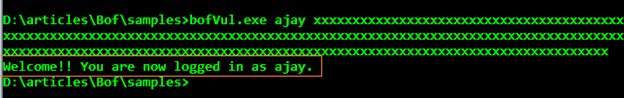 This program was running perfectly up till now, but now imagine if a person with a vicious intention enters the parameters in the following form. He is trying to overflow the buffer by entering some garbage values and finally notices that we successfully penetrate the program even without having the correct user name and password. Bingo!!!!!!!!! It is even revealing the welcome message which is flashed when the user enters the correct credentials. So, this is a bit strange, how can this be possible? We have just entered a sequence of raw data in spite of the password and successfully obtained access.