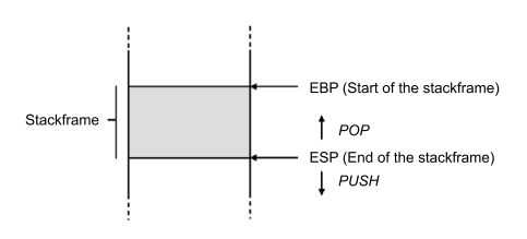 If a method is called by assembler 'call' commands, a new stackframe is created, with boundaries defined by the EBP and ESP. First, the call command pushes the EIP into the stack to start execution. The previous ESP becomes the new EBP and then space for variables is allocated by subtracting its size from the earlier ESP. Finally, at the end of the function call, the ESP becomes the new EBP.