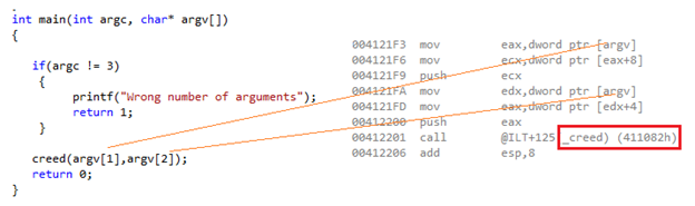 Now, the creed() function instruction next instruction address 0x00412206 is saved to the stack, and execution jumps to ebp in the creed() instruction code where user name and password values are copied into eax, which are pushed into stack. Finally, on behalf of both strcpy offsets, the strcmp instruction is executed.