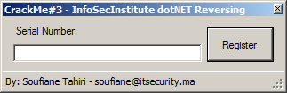 A nag screen that we have to remove and a windows form asking for a serial number, and we will discover together how we can use some creative round trip engineering to remove all protections present on this Crack Me.