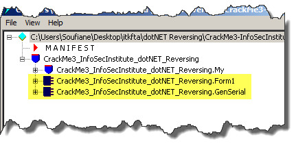 First of all, let's disassemble our Crack Me using ILDASM and see the IL code embedded in our managed module. To avoid getting lost, let's just focus on two nodes: