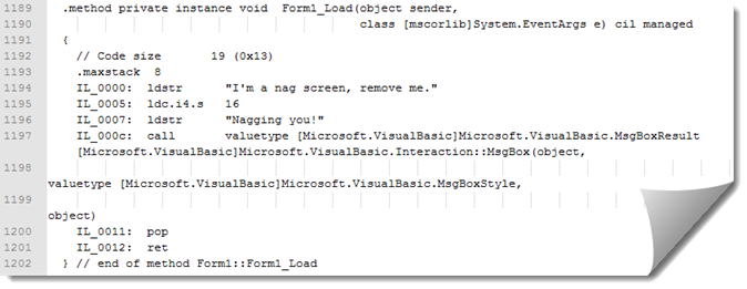 Ldstr "I'm a nag screen, remove me." Creates an object of type string from the given string constant and loads a reference to this object onto the evaluation stack, these kind of constants are stored in the metadata, and this common